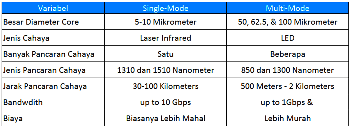 Kabel fiber optik single mode dan multi mode. Dengan ukuran yang besar dan na yang tinggi maka terciptalah teknologi fiber optik multi mode ini. Biasanya ukuran na yang terdapat di dalam kabel multi mode pada umumnya adalah berkisar antara 0 20 hingga 0 29. Kabel fiber optik mode tunggal single mode adalah kabel jaringan yang hanya mempunyai satu buah transmisi sehingga hanya dapat meredakan cahayanya dengan melalui satu inti pada satu waktu. Single mode dapat membawa data dengan bandwidth yang lebih besar dibandingkan dengan multi mode fiber optik tetapi teknologi ini membutuhkan sumber cahaya dengan lebar spektral yang sangat kecil pula dan ini berarti sebuah sistem yang mahal.